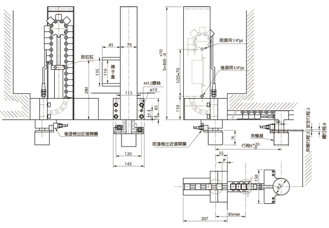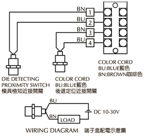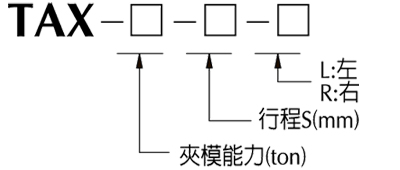 利用气压机构作动,使夹模器独立进行夹持,适合大型油压机上模使用。 夹模器 F N P TAX-4 68 68 24 TAX-6 78 73 16 TAX-10 98 79 6 机台图示 端子盒配电示意图 客户台盘固定孔位及 T 槽尺寸范围 系统解说 TAX 自走式夹模器 TR 旋转夹模器 TS 摇摆夹模器