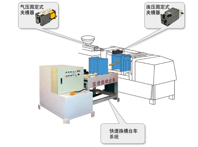 特点 • 机台盘面加工尺寸 ( 装置物品之固定孔 ) • 机台自动调整模开 ( 输入模厚参数,机台会自动 +10 ~ 15 mm ) • 机台预留与换模台车的对话功能 • 机台安全门尺寸修改配合 • 模具定位槽加工/模板倒角 • 模具勾拉用固定板加工 系统解说 气压固定式夹模器 油压固定式夹模器 快速换模台车系统 系统解说 系统规划 应用范例 模具交换方式