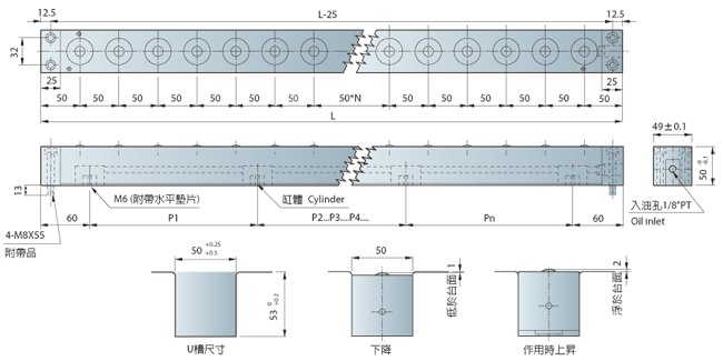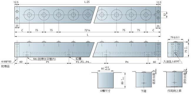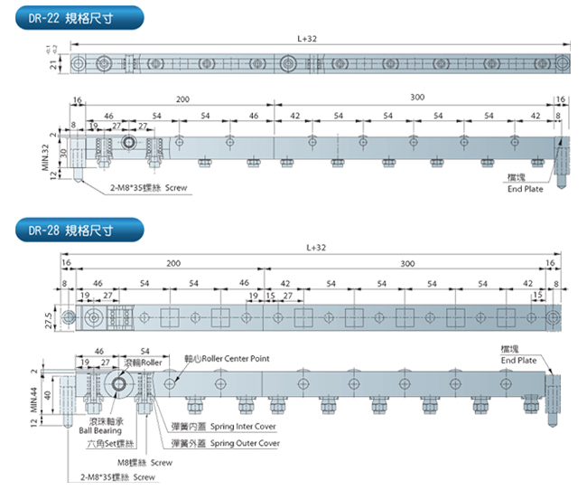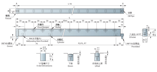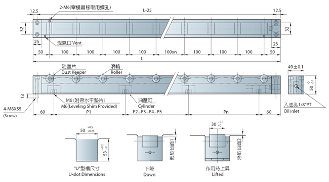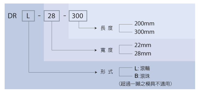 | 型号 | 总长度 | 滚珠数 | 载模能力 | 油压缸 (kg) | |