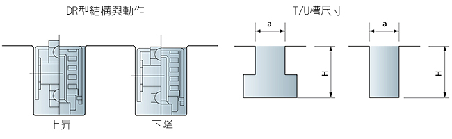 DR 型举模器可藉由填隙片的增减,很容易的适用不同尺寸的 "T" 型槽或 "U" 型槽。 其基本长度有 200 mm 与 300 mm 两种尺寸,经过搭配使用,可产生每 100 mm的总度变化。