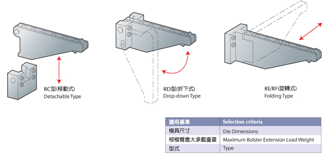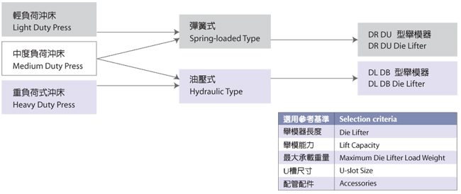 依据冲床吨数选择 DL 型 ( 油压型 ) 或 DR 型 ( 弹簧式 ) 此外并需将模具重量与所需举模器之长度一并考虑