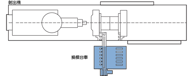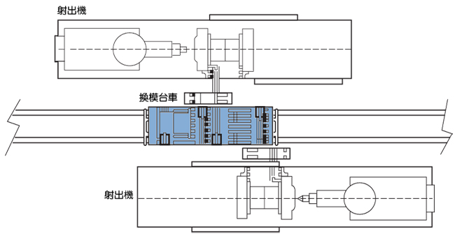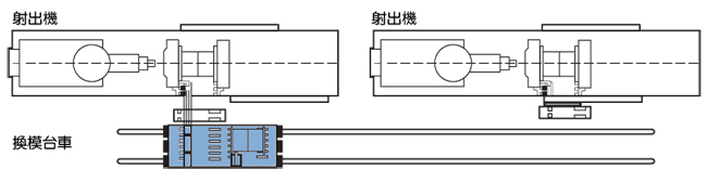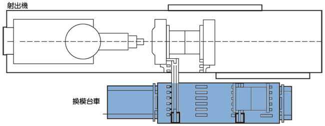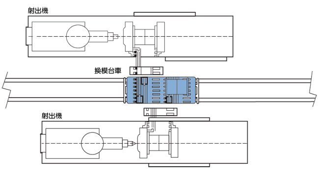 台车系统能根据厂房型式:射出成型机的配置,模具置放方式等诸条件的不同个别设计之。因此,若新设立工厂时,初期阶段即与本公司讨论可规划出更理想的 Q.M.C.S 换模系统。 双模具移动台车 ( 上视图 ) 单模具固定台车 ( 上视图 ) 双向移动台车 ( 上视图 ) 设备相反方向 设备同一方向 直列式共享移动台车 ( 上视图 ) 系统解说 系统规划 模具放入图例 模具交换方式