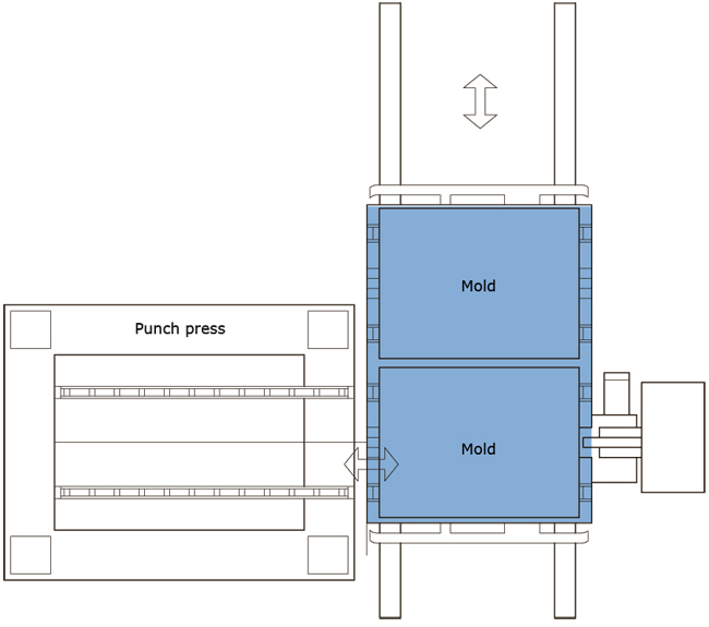 Die changes are performed using a 2-die cart that serves two or more presses that are positioned along one line. This allows for a wide application of quick die changing.