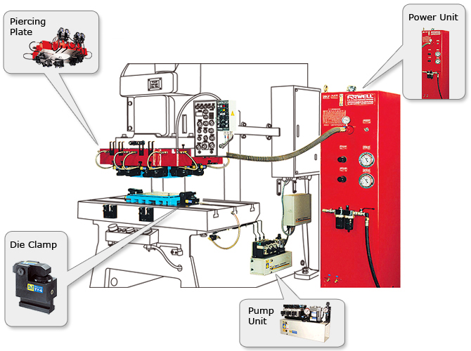 Forwell’s PCB Fine Piercing Systems combine a hydraulic power unit charged with air pressure, a piercing plate and a quick die change system. This system uses hydraulic pumps to activate the pressing operation, either using automatic or manual control. Also due to the hydraulic power unit, this system is very energy efficient and highly reliable, and with its simple structure easy maintenance is ensured.