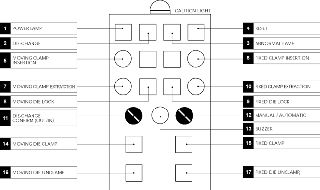 The easy to use control panel offers a simple interface to monitor and control operations of the Quick Mold Change System. The upper half of the screen displays automatic functions while the lower half can be used for operator-controlled functions. This makes this machine easy to control yet still have the functionality needed of a Quick Mold Change System.