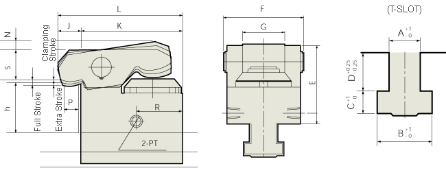 | * Clamps with a dimension greater than Max.h+D are also optionally available. * Specify T-slot dimensions (A.B.C.D) and clamping height (H) when ordering. * Clamping strokes and extra strokes are for standard models; custom strokes available on request. |