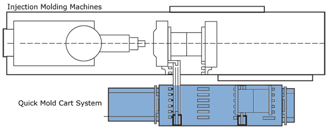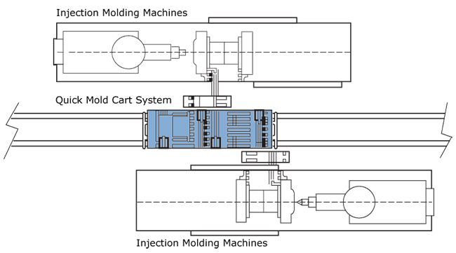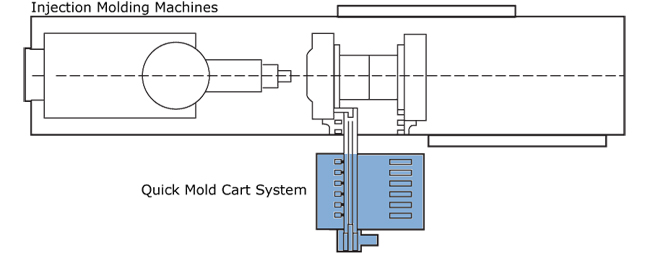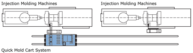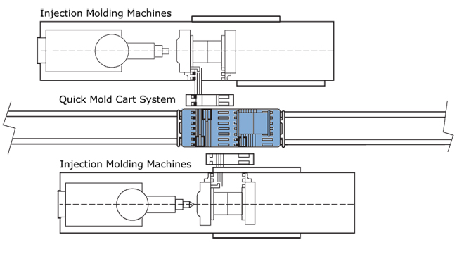 Forwell can design the most practical and efficient Quick Die Change System according to your plant layout and equipment. To further improve the efficiency of your mold changes, this system can be paired with Forwell’s Mold Cart System to create a fully automatic mold change system for your plastic injection production lines. When establishing a new production facility, please contact Forwell directly to see how beneficial a Quick Mold Change System and Mold Cart System can be for enhancing your productivity. Below you can see the different layout configurations possible when combining Forwell’s Quick Mold Change System with Forwell’s Mold Cart System: