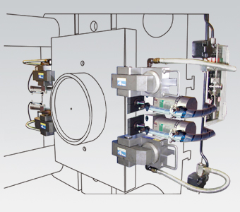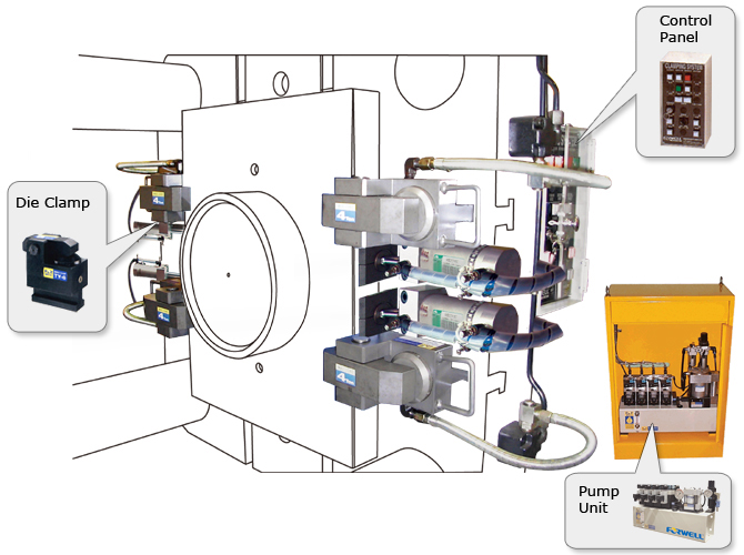 Forwell’s Quick Mold Change System can be designed to fit almost any injection molding machine and mold casting machine to allow for quicker mold change times, resulting in shorter machine down time and increased productivity. This system uses a special mold clamp that does not require a cut out on the mold, increasing its application versatility and allowing it to be used with a large number of different molds.