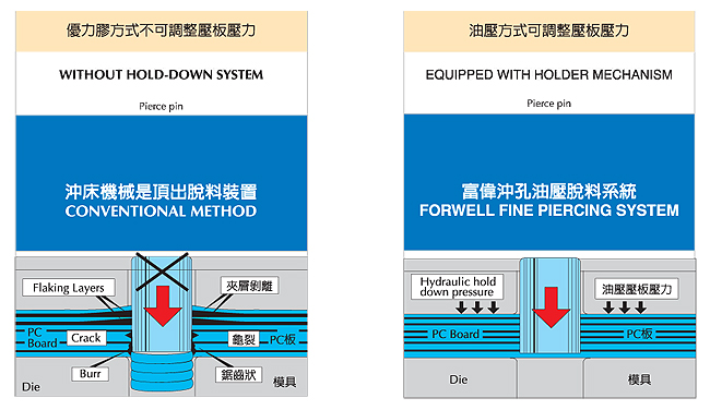 • 操作及調整容易。 • 精確度高,安全又耐用。 • 適合任何電路板之沖孔脫料作業。 • 配備快速換模系統,提高生產效率。 • 達到自動化、省力化、提高加工品質的要求。 高品質沖孔油壓脫料作業之重點 特殊設計結構,打板經精密加工及硬化處理,多層油封設計。動作滑順均勻,脫料出力平均。 使用效益 工作流程 1. 壓板壓力工程 2. 沖孔工程 3. 沖孔完畢工程 4. 脫料壓力工程