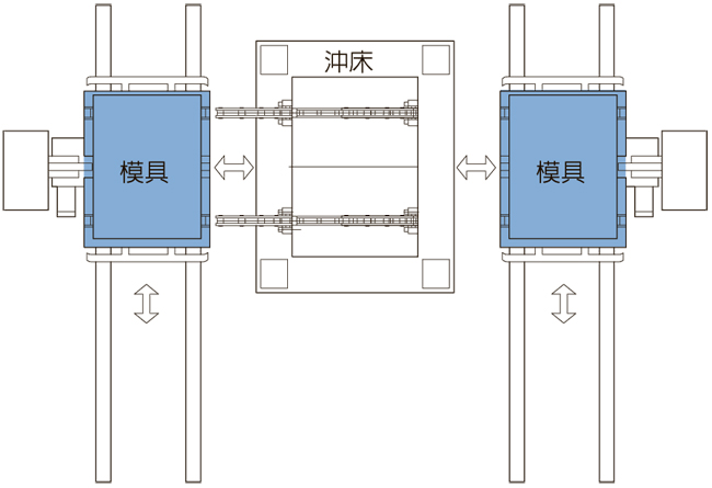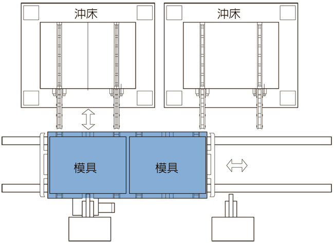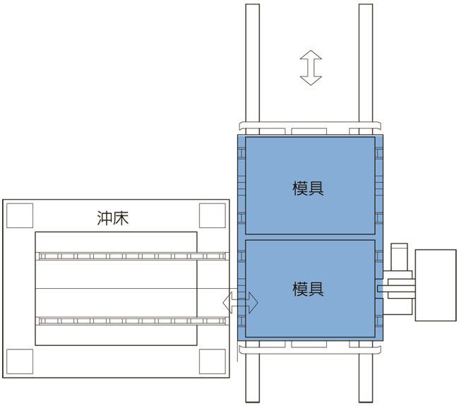 雙向移動式 雙模雙台車同步進行,在最短時間內更換模具,節省換模時間。 直列共同移動式台車 使用移動軌道和移動台車進行換模,可多台共用,適用範圍較廣。 單機雙模移動式 側向入模,避免機械手阻礙。 系統解說 系統規劃 應用範例 產品問答