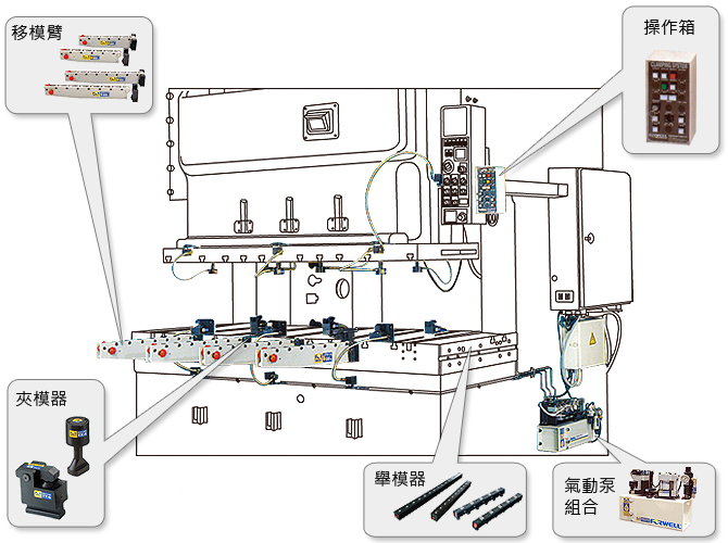 FORWELL Q.D.C.S 沖床專用快速換模系統,提供給各式沖床模具多樣性的快速換模專用元件,此系統的使用,不僅降低了沖床的閑置時間,並且大大的促進了產能的提升,使得生產管理更為合理化。 系統解說 移模臂 操作箱 夾模器 舉模器 氣動泵組合 系統解說 系統規劃 應用範例 產品問答