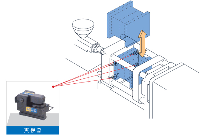 模具放入圖例 水平方式 模具水平放入時,可使用換模台車方式,更換模具,更具安全性,並達成整廠快速換模系統之規劃,使得模具之輸送及儲存更具自動化。 垂直方式 一般射出成型機或壓鑄機模具垂直放入方式使用最多, FORWELL Q.M.C.S 提供夾模器可移開方式換模系統,不僅減低機台的閒置時間,並且促進產能的提升,使得生產管理更為合理化、自動化。 系統解說 系統規劃 模具放入圖例 模具交換方式