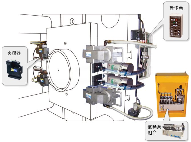 特性 FORWELL Q.M.C.S 提供給各式射出機、壓鑄機模具多樣性的快速換模專用元件,此系統的使用,不僅減少了閒置時間,並且大大的促進了產能的提昇,使得生產管理更為合理化。 系統解說 夾模器 操作箱 氣動泵組合 系統解說 系統規劃 模具放入圖例 模具交換方式
